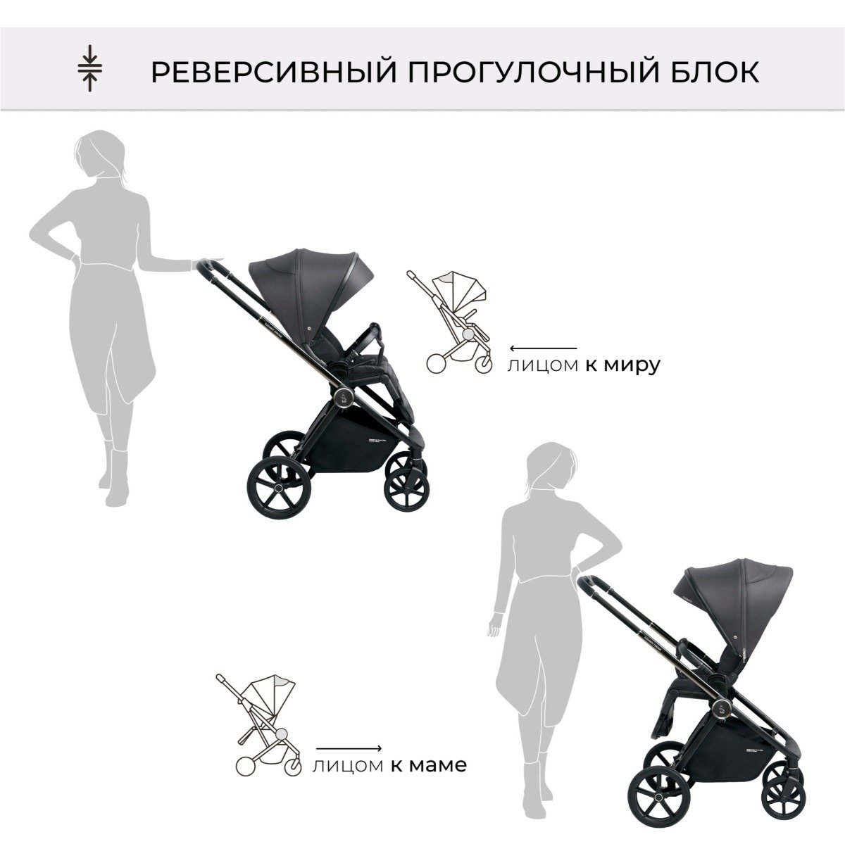 Реверсивность. Установить прогулочный блок на шасси можно как по ходу движения (лицом к родителю), так и лицом к миру;